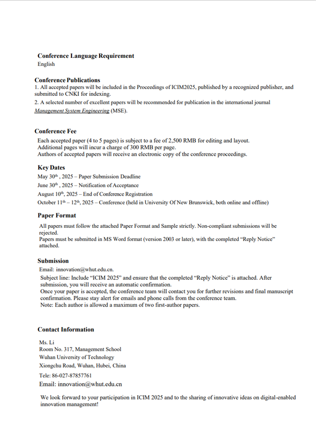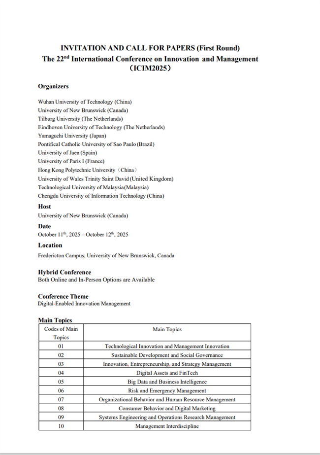 INVITATION AND CALL FOR PAPERS (First Round) The 22nd International Conference on Innovation and Management (ICIM2025)