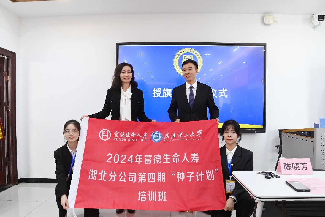 随后,桂衍胜总经理代表公司向学校授予人才培训基地牌匾,陈晓芳院长代表学校向培训学员代表授予班旗。