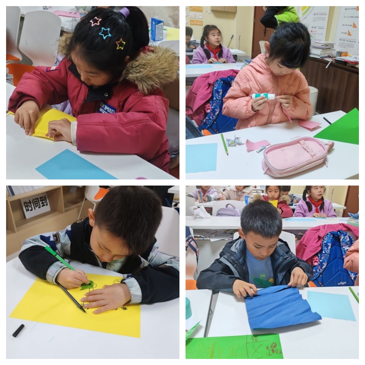 “中国扇子”文化课则充满诗意与巧思。志愿者通过视频展示扇子从战国羽扇到明清折扇的千年演变,讲解“羽扇纶巾”“团扇题诗”等文人典故,孩子们听得入神。动手环节中,孩子们用卡纸、彩笔创作属于自己的扇子:有的绘上江南烟雨,有的题写“清明时节雨纷纷”的诗句,还有的将狼牙山五壮士的英勇场景融入扇面。一名学生举着团扇自豪地说:“我要把扇子送给爷爷,告诉他今天学的英雄故事!”