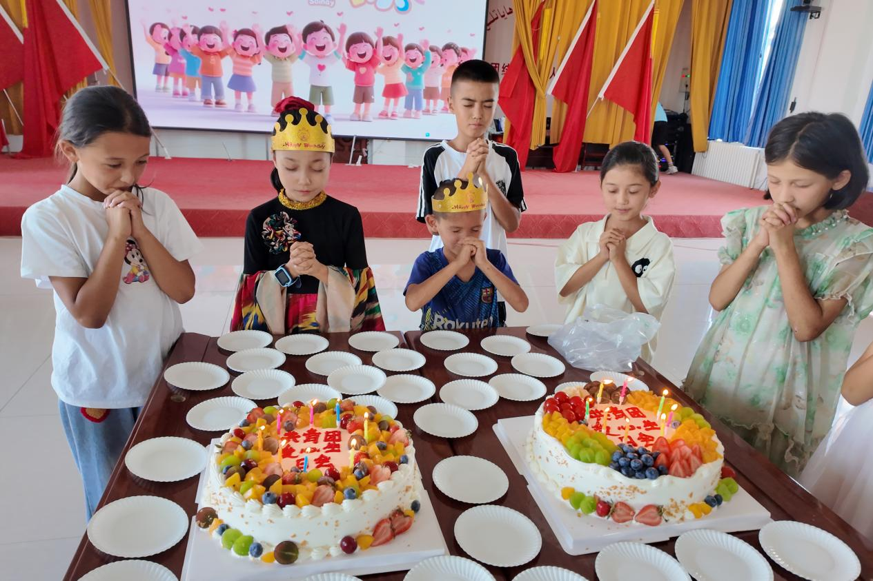 生日会现场,110余名各民族小朋友精心准备了生日会节目,大家一起用灵动飘逸的曼妙舞姿、柔美优雅的手势舞蹈、清脆悦耳的童声合唱、摇曳生姿的民族走秀为过生日的同学送上祝福。在生日歌欢快的旋律下,“小老师”与小朋友们一起许下愿望,祝福大家在新的一岁里无忧无虑、平安喜乐。村民们自发为小朋友们带来酸奶、干果、奶茶等新疆传统美食,大家欢聚一堂,在品尝美味的过程中传递民族团结、互助互爱的情谊。