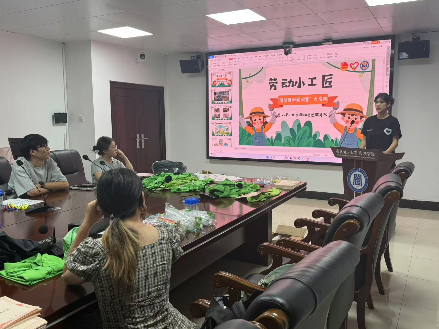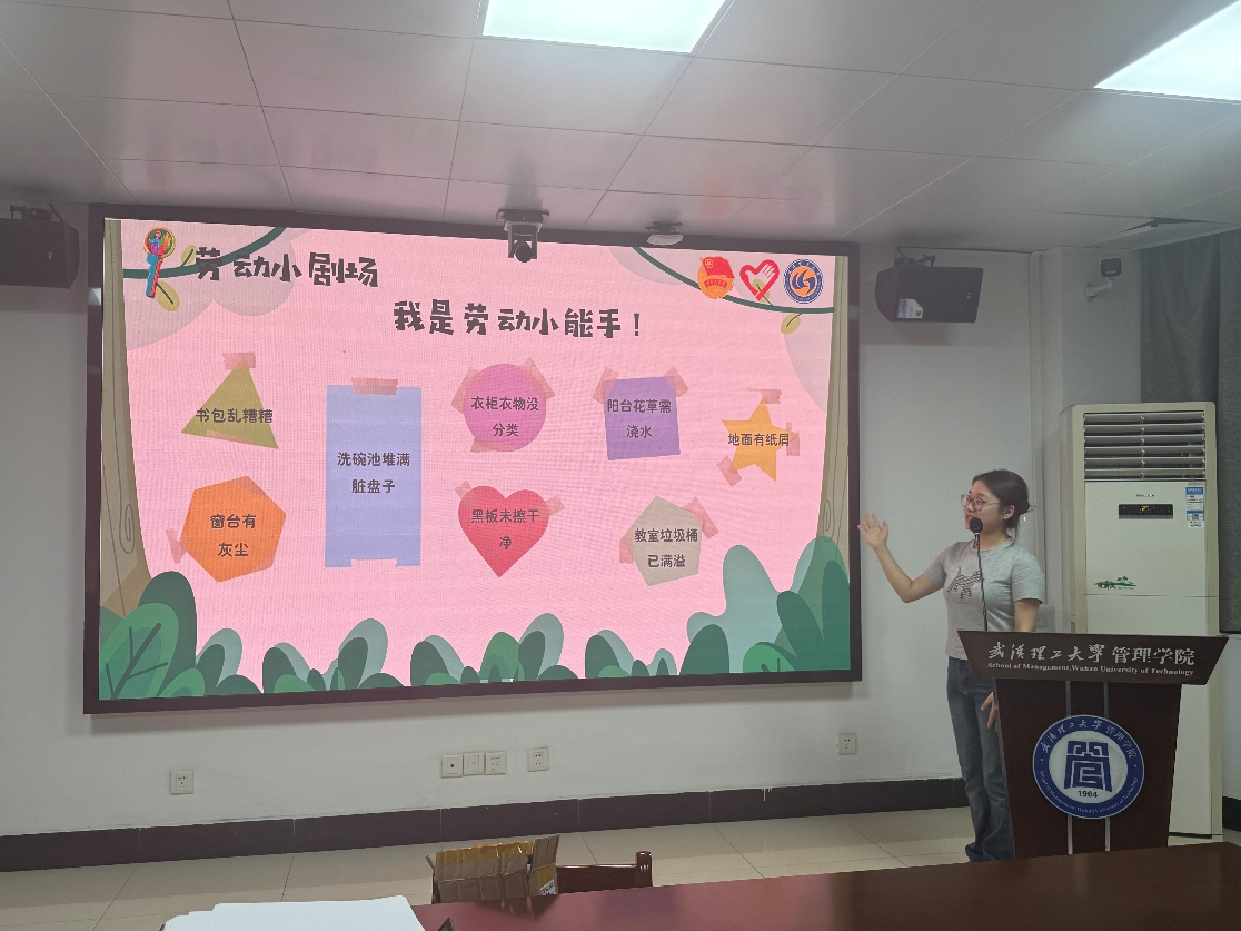 会议第二环节,志愿者曾玉环进行“劳动小工匠・魔法劳动实验室”主题课程试讲。围绕“认识劳动场景、理解劳动意义、提升动手能力”三大教学目标,通过“劳动小剧场”“垃圾分类挑战赛”等互动环节,呈现贴合低年级学生特点的教学全流程。现场志愿者全程专注,在互动中实地感受课堂节奏与教学组织方式。试讲后,她补充讲解语态表达、控场技巧等细节,助力志愿者提升教学信心与课堂掌控力。