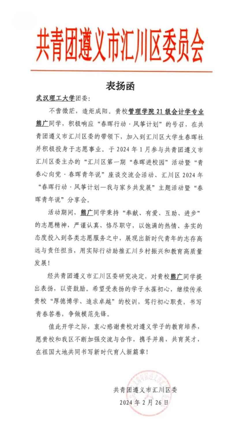 近日,学校团委收到了一封来自共青团遵义市汇川区委的感谢信对太阳成官网44118太阳成城集团21级会计专业的熊广同学参加遵义市汇川区“春晖行动”志愿服务投身贵州省“春晖行动·风筝计划”表示衷心感谢。